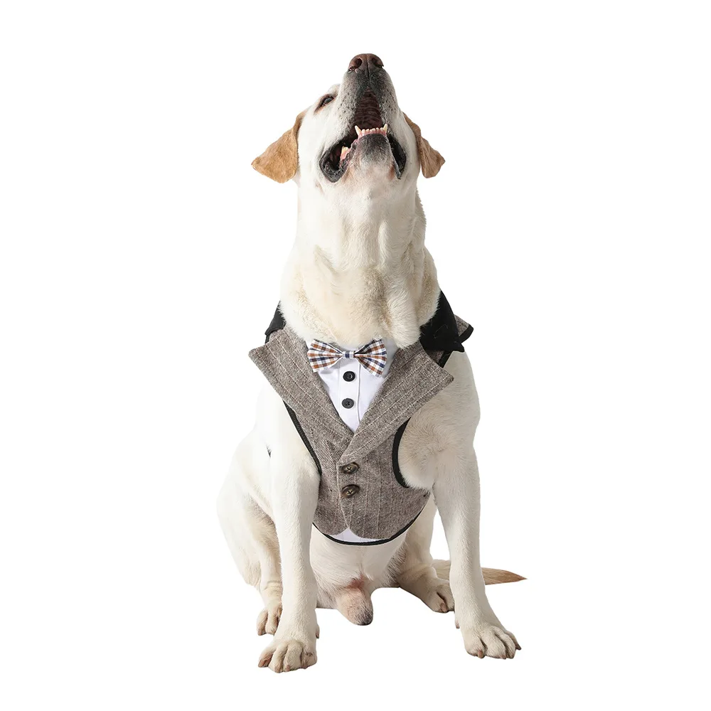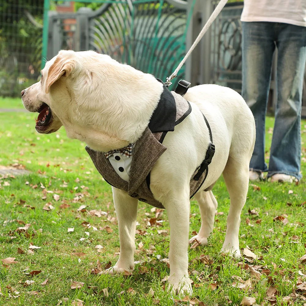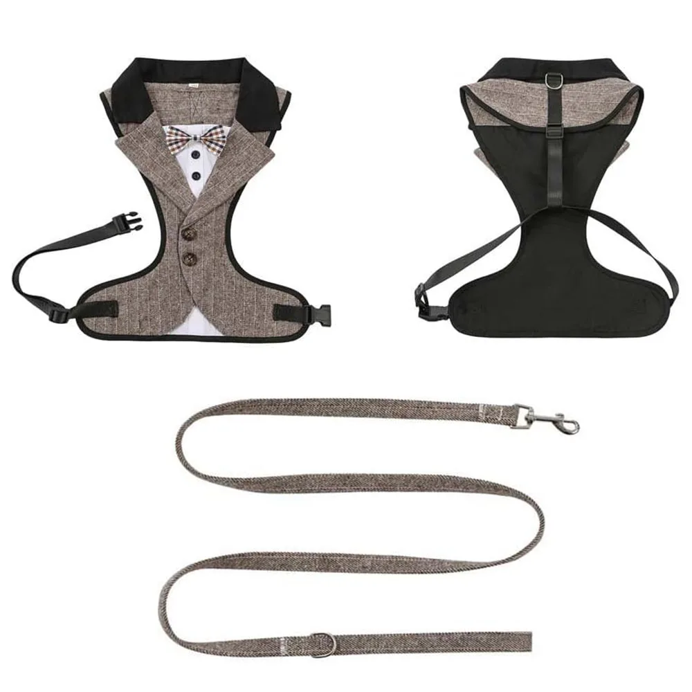 This dog bow tie suit harness leash set is a complete formal outfit for pets of all breeds. Designed with a stylish tuxedo vest and matching bow tie, it’s perfect for weddings, parties, or special occasions. The comfortable harness ensures safety and control while walking, combining fashion with functionality. Ideal for French Bulldogs, small or large dogs, this elegant pet costume makes your furry friend look dapper and ready for any celebration.