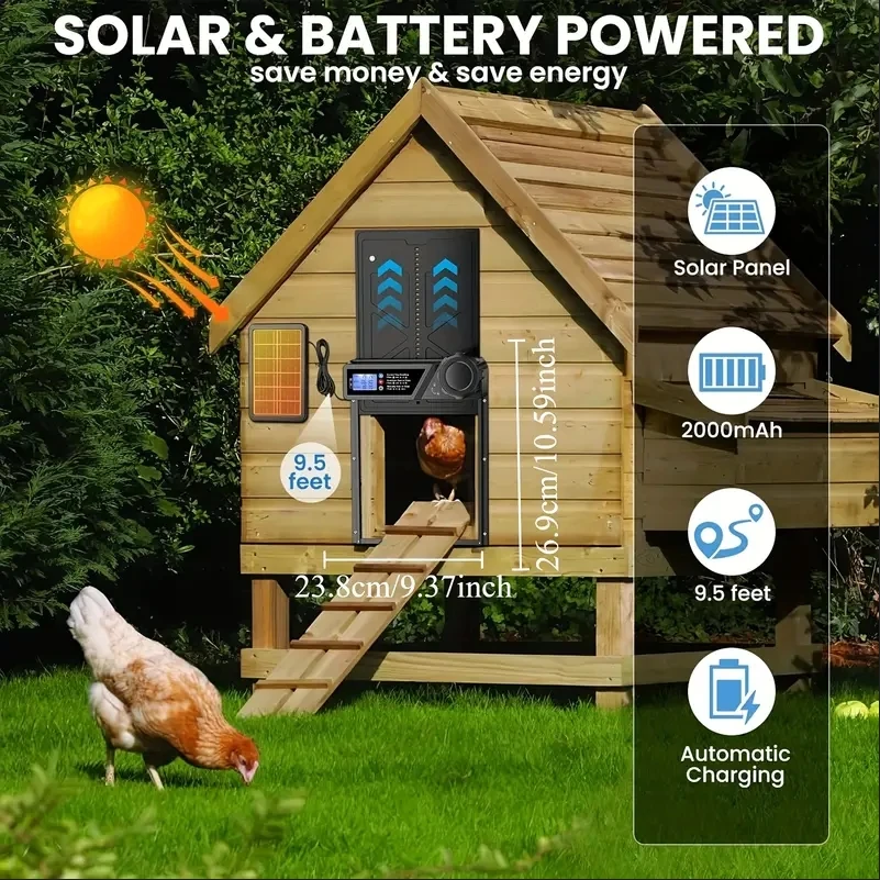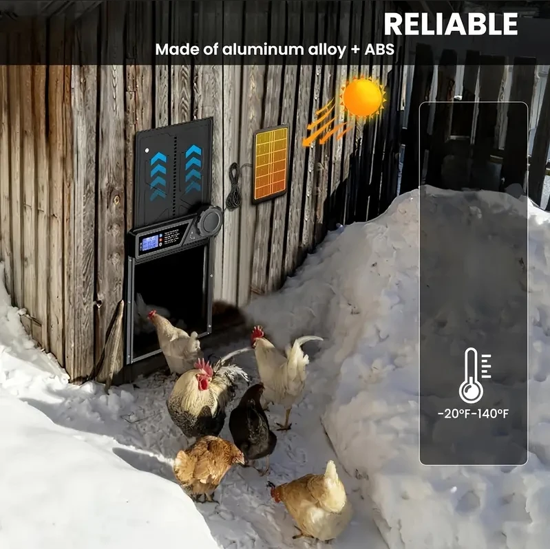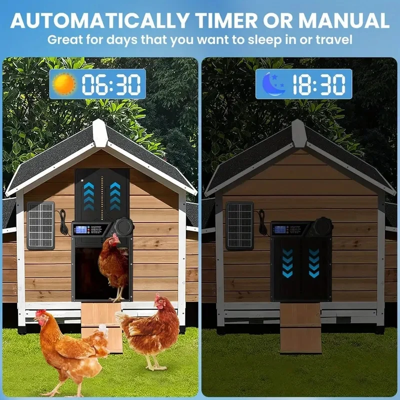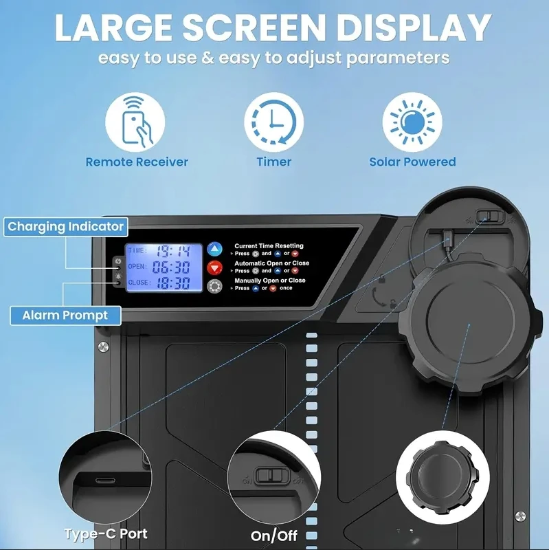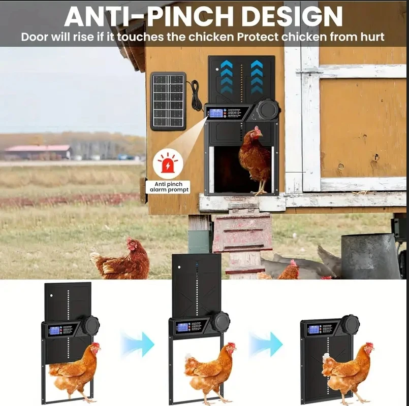 This solar-powered automatic chicken coop door offers safe and convenient access control for your poultry. Equipped with anti-pinch protection, it automatically stops and reverses if an obstruction is detected, helping prevent injury to chickens. The large LCD display screen makes setup simple, allowing you to easily adjust timer settings or activate light sensor mode for automatic opening and closing based on daylight.